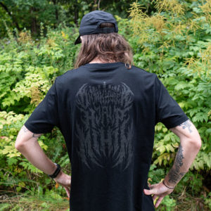 Överfett metalinspirerat tryck på bröstet och dessutom med tryck på hela ryggen, som uppmanar förbipasserande att tillkalla hjälp vid eventuell krybning. OM JAG KRYBER HJÄLP MI HIM!