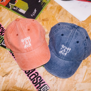 En klassisk Dad Cap i ostrukturerad modell. På kepsens front finns ”Grogg & DVD” broderat i vitt.