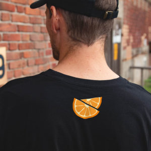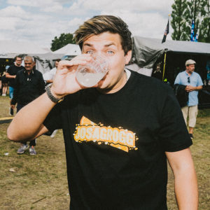 Stilrent T-shirt med läskande tryck – JOSAGROGG. Stort tryck på bröstet, samt litet tryck i nacken och med ett recept på insidan för den glömske JG-blandaren. Gjord av 100% organisk bomull. Medium passform. Danny som är 179cm har på sig storlek XL på bilden.