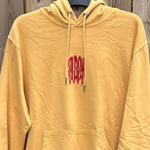 Gul-ockra hoodie i tvättad look med SLASK tryckt på bröstet och ryggen. Gjord av 85% organisk bomull och 15% återvunnen polyester i unisex-modell. Medium passform och ficka på magen.
